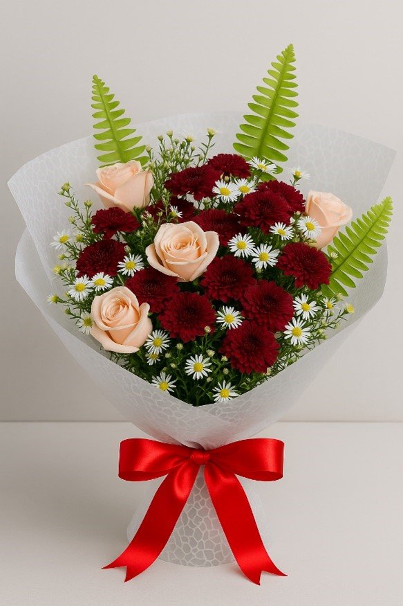 Bring a touch of timeless elegance to any occasion with our Classic Romance Mixed Bouquet. This thoughtfully curated arrangement features deep burgundy chrysanthemums, soft peach roses, and cheerful white daisies, all delicately interwoven with lush seasonal greens and wrapped in a sophisticated ice-patterned cellophane. Finished with a bold red satin ribbon, this bouquet strikes the perfect balance between warmth, passion, and charm.