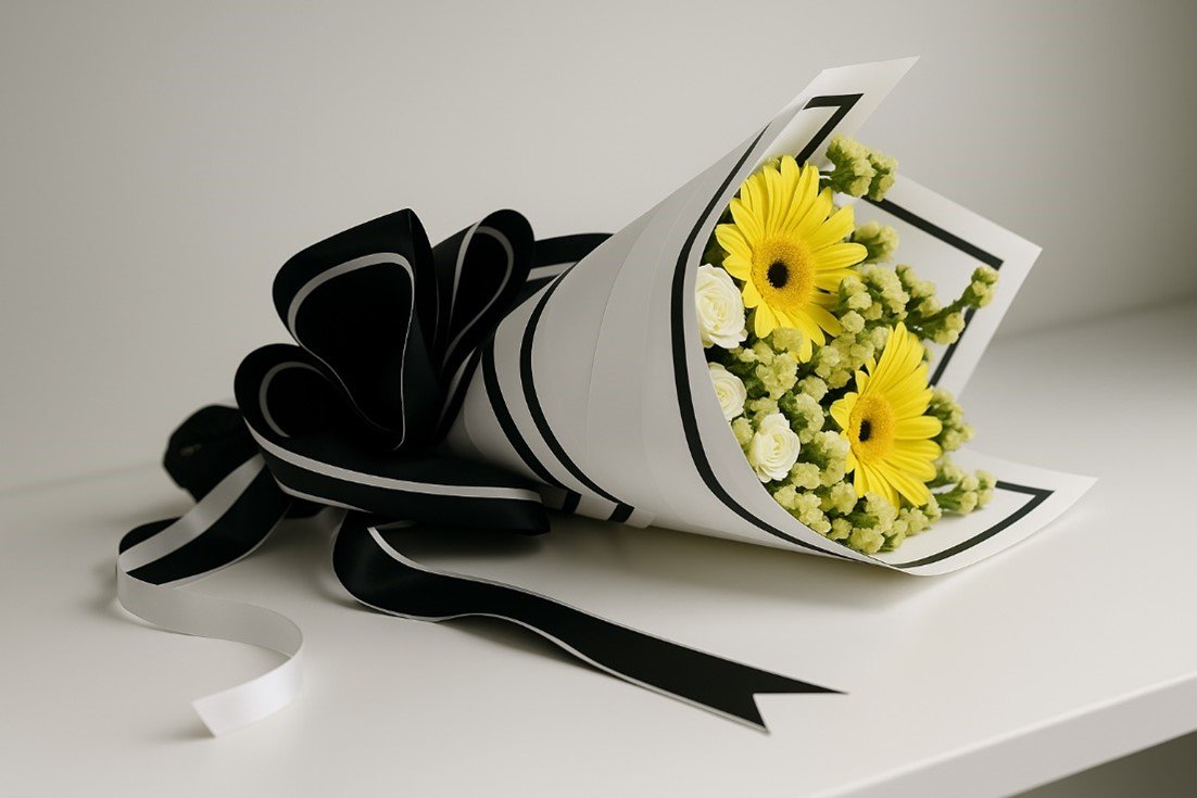 Bring warmth and radiance into any room with our Sunshine Charm Bouquet – a vibrant medley of fresh yellow Gerbera, creamy white roses, and soft green fillers, artfully arranged in a sleek monochrome wrap accented with satin ribbon.
