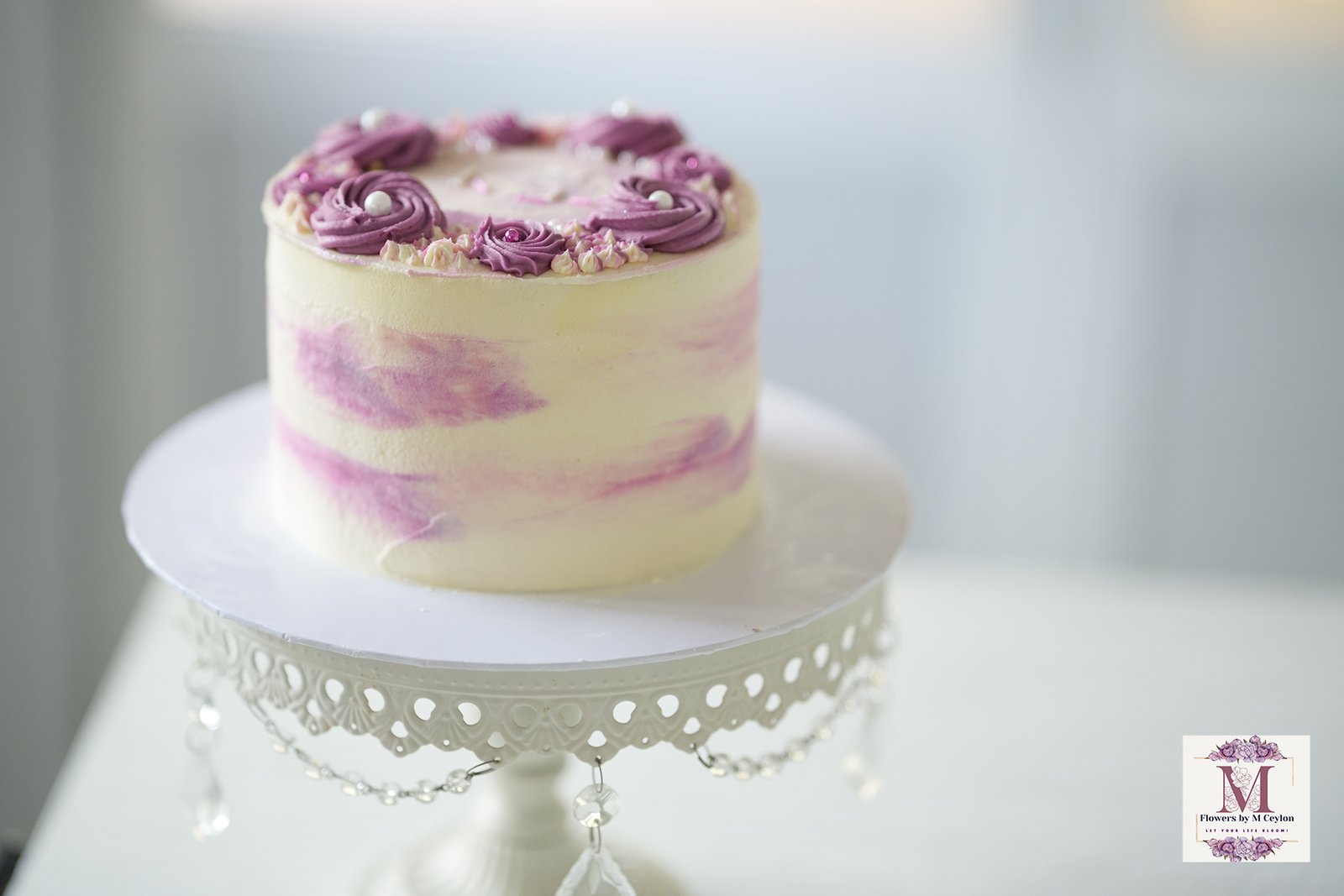An elegant, petite centerpiece featuring a hand-brushed lilac watercolor finish and deep purple buttercream rosettes. Finished with delicate pearls, it’s a sophisticated choice for birthdays, anniversaries, or tea parties.